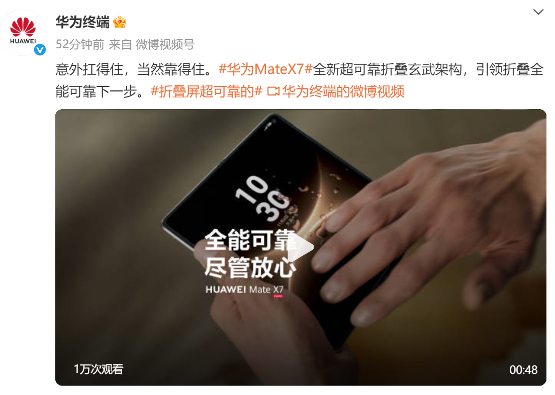 每经AI快讯,11月18日,据华为终端消息,即将发布的华为Mate X7搭载全新折叠玄武架构,官方表示该架构在抗水、抗跌落、抗压、抗冲击等方面均实现技术升级和完善。