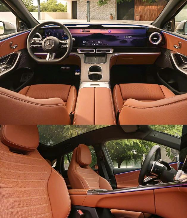 来看内饰部分,车内已经采用上了贯穿样式的大联屏设计,电气化程度非常足,这也是奔驰首次采用这种尺寸达到39.1英寸的高清大屏。值得一提的是,屏幕内部拥有超过一千颗LED的光柱,背景是会发光的,豪华感与智能化会进一步升级,形成律动效果。